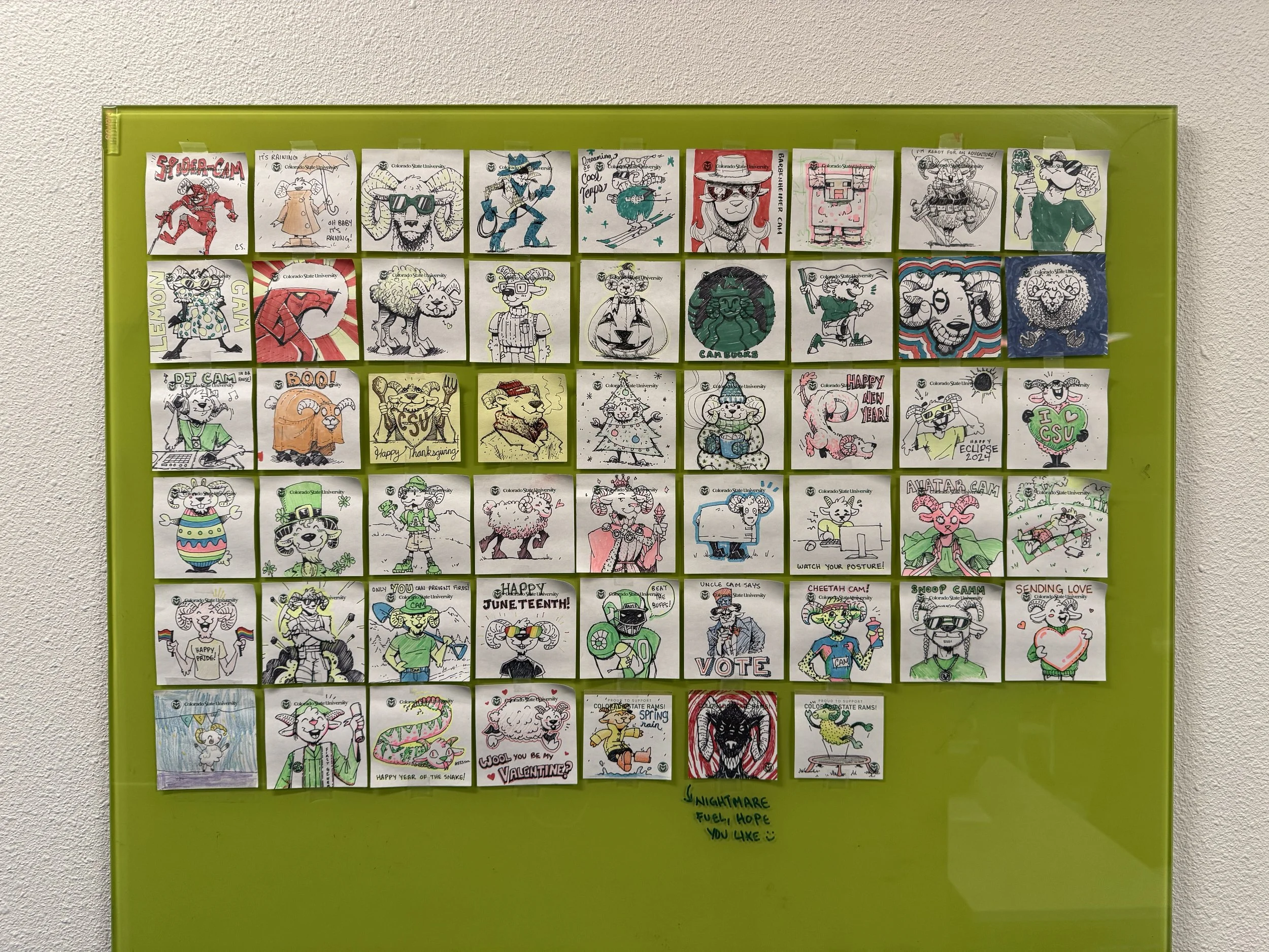 Another fun way I’ve drawn CAM is an internal office whiteboard filled with sticky notes. The idea started after I watched Spider-Man: Across the Spider-Verse, and slapped one doodle onto an unused whiteboard in the hopes it brightened someone’s day. Cue to over two years later, and a doodle a week added up to a whole board of CAMs! These have been wonderful icebreakers and a great way to add some whimsy to an often tense environment.