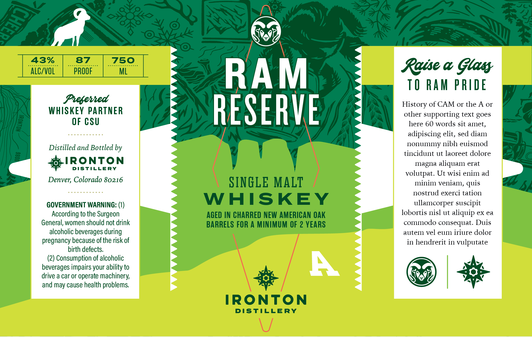 Our team and Ironton also collaborated on naming the new whiskey blend. I brainstormed a list, using CSU traditions or wordplay with ram/sheep language. After presenting the concepts above with a few of my personal favorites as placeholder typography, our stakeholders chose favorites in a collaborative meeting.