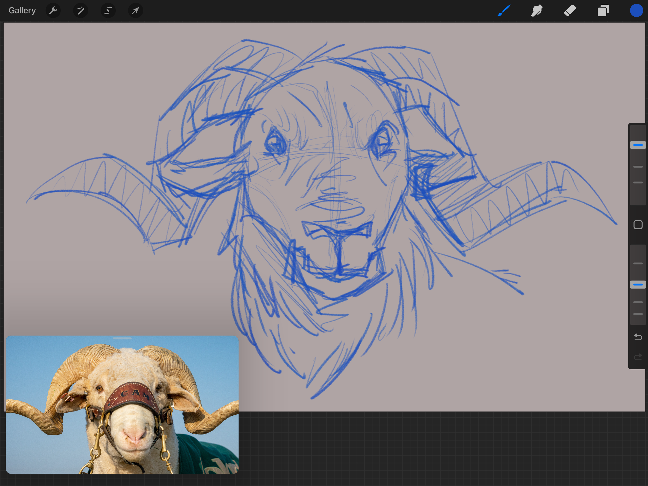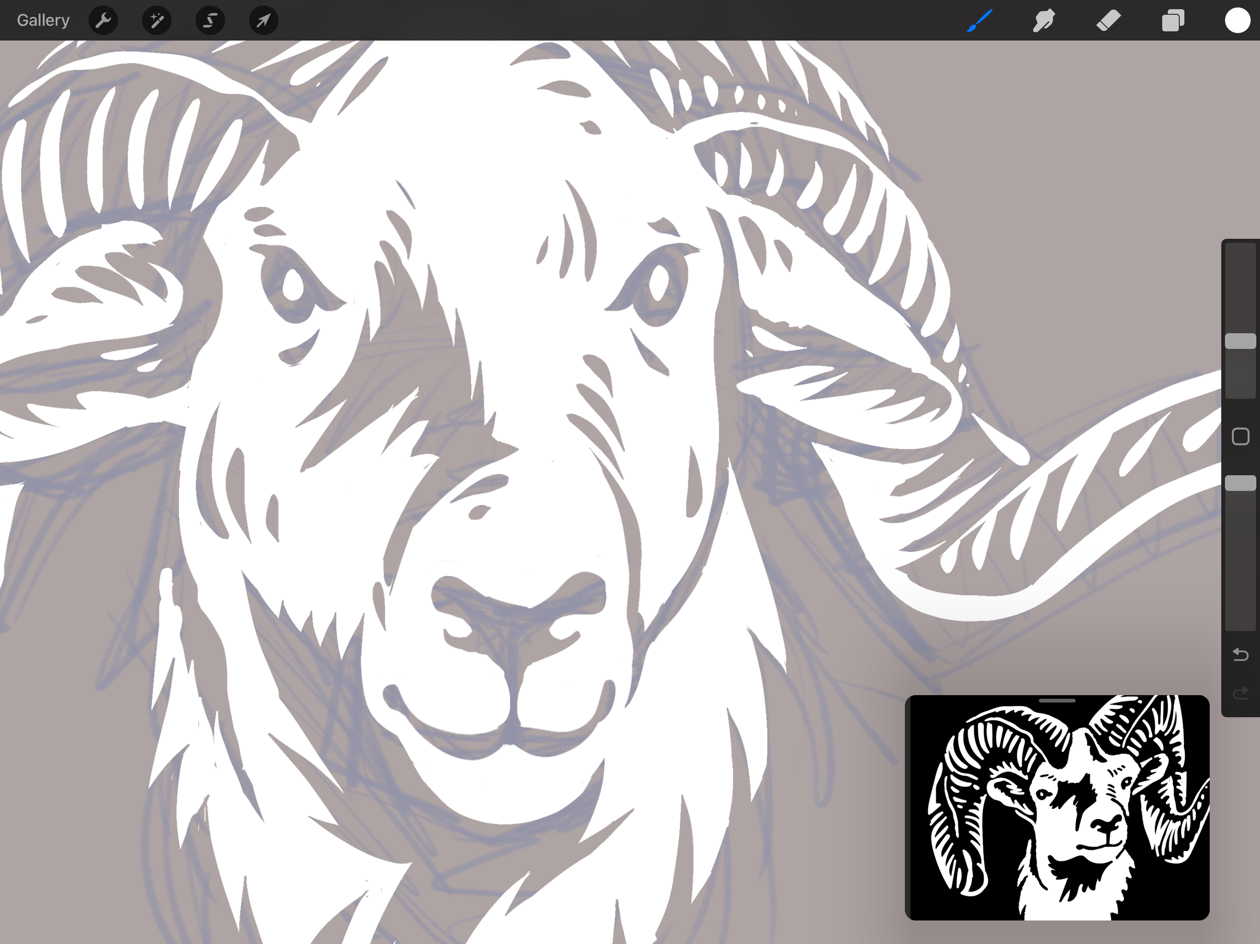 With our stakeholder’s approval of the first direction, I began illustrating a hero ram that more accurately reflected our animal ambassador’s breed, a rambouillet sheep. I initially illustrated in Procreate on the iPad, studying off a photo of CAM. I used the original stock ram illustration as a style guide to help me mimic the woodcut look our stakeholders approved of.