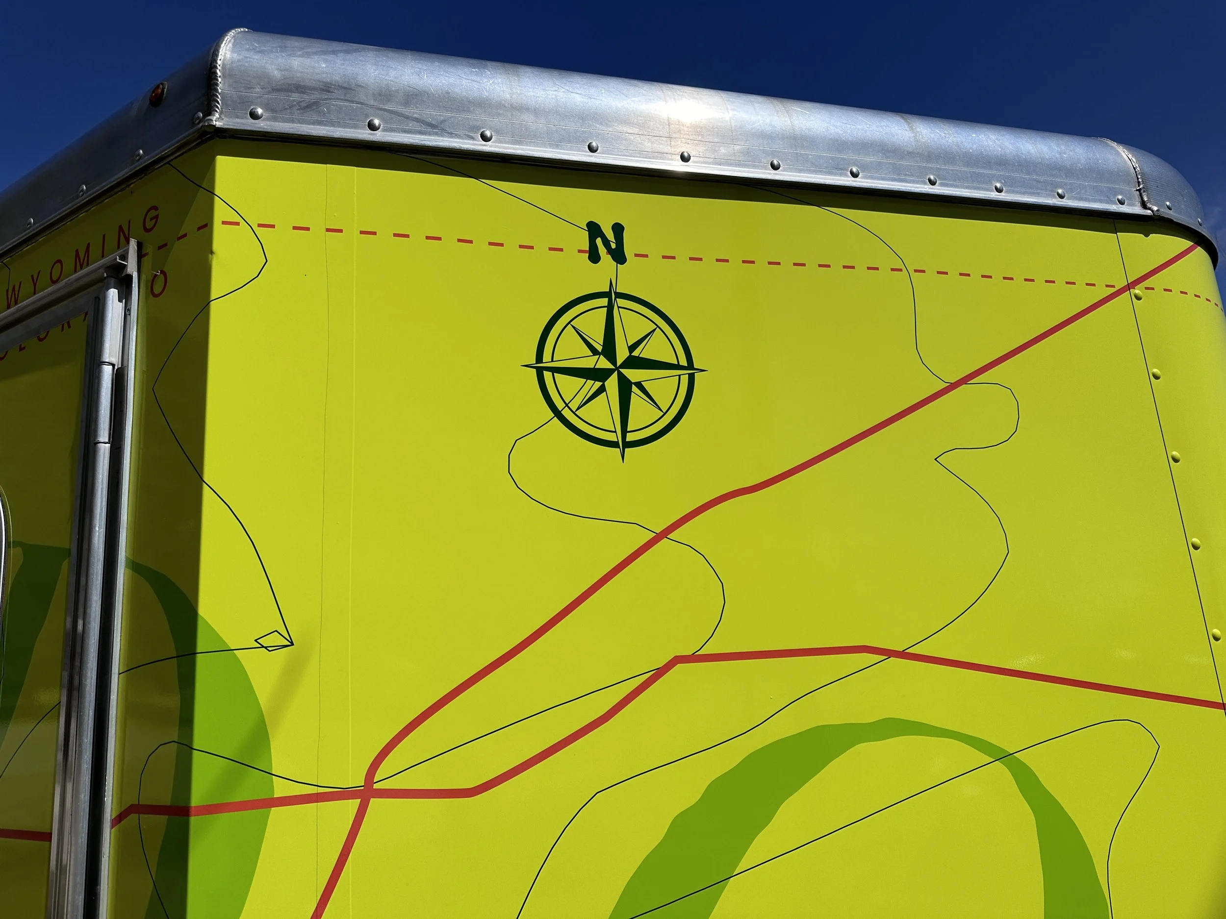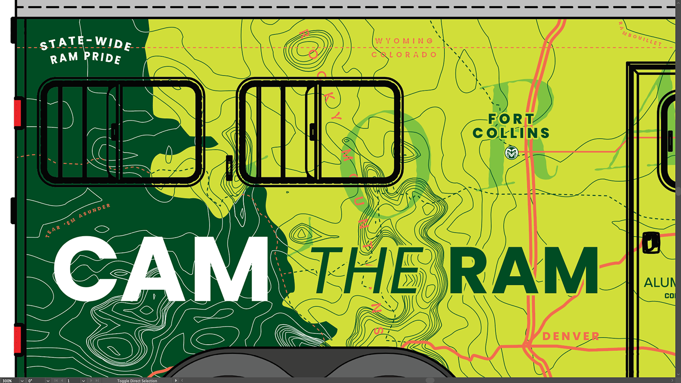 The first sketch played into the speed of a vehicle, spraying up colorful splotches of color from the CSU Green truck. The second sketch explored a topographic map of Colorado, since this trailer would be going on the road across the state. The third sketch was having fun with the star inside, a sort of Taylor Swift Eras Tour poster collage plastered across the vehicle .