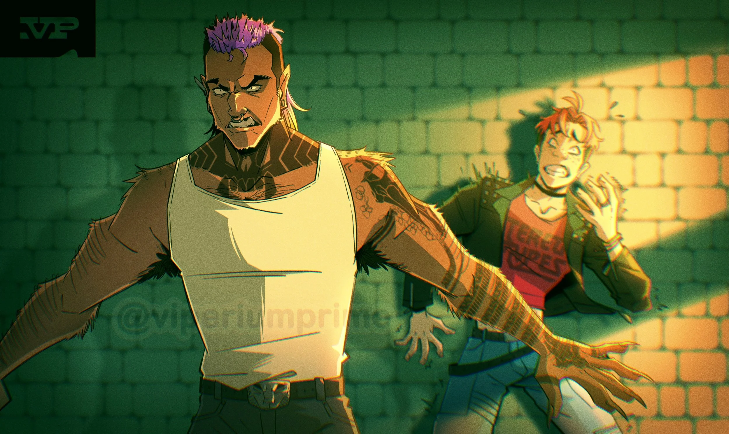 I have explored TY’s werewolfism (to the right), a painful and brutal transformation he does his best to avoid. It’s triggered by the full moon of course, but also intense emotion. You can see him slightly transform in shock in one of the illustrations below, at the sight of his friend at the front door.